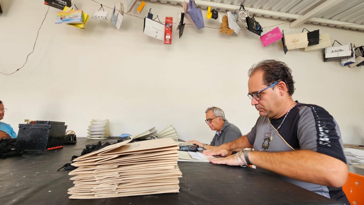 A transição trouxe vantagens importantes. Diferentemente dos produtos em couro, que dependiam da venda, a nova atividade funciona como prestação de serviço, com pagamento por unidade de sacola produzida. Isso garante retorno financeiro imediato aos oficineiros e abre espaço para atender um número maior de clientes, especialmente gráficas que buscam terceirizar a montagem das sacolas.